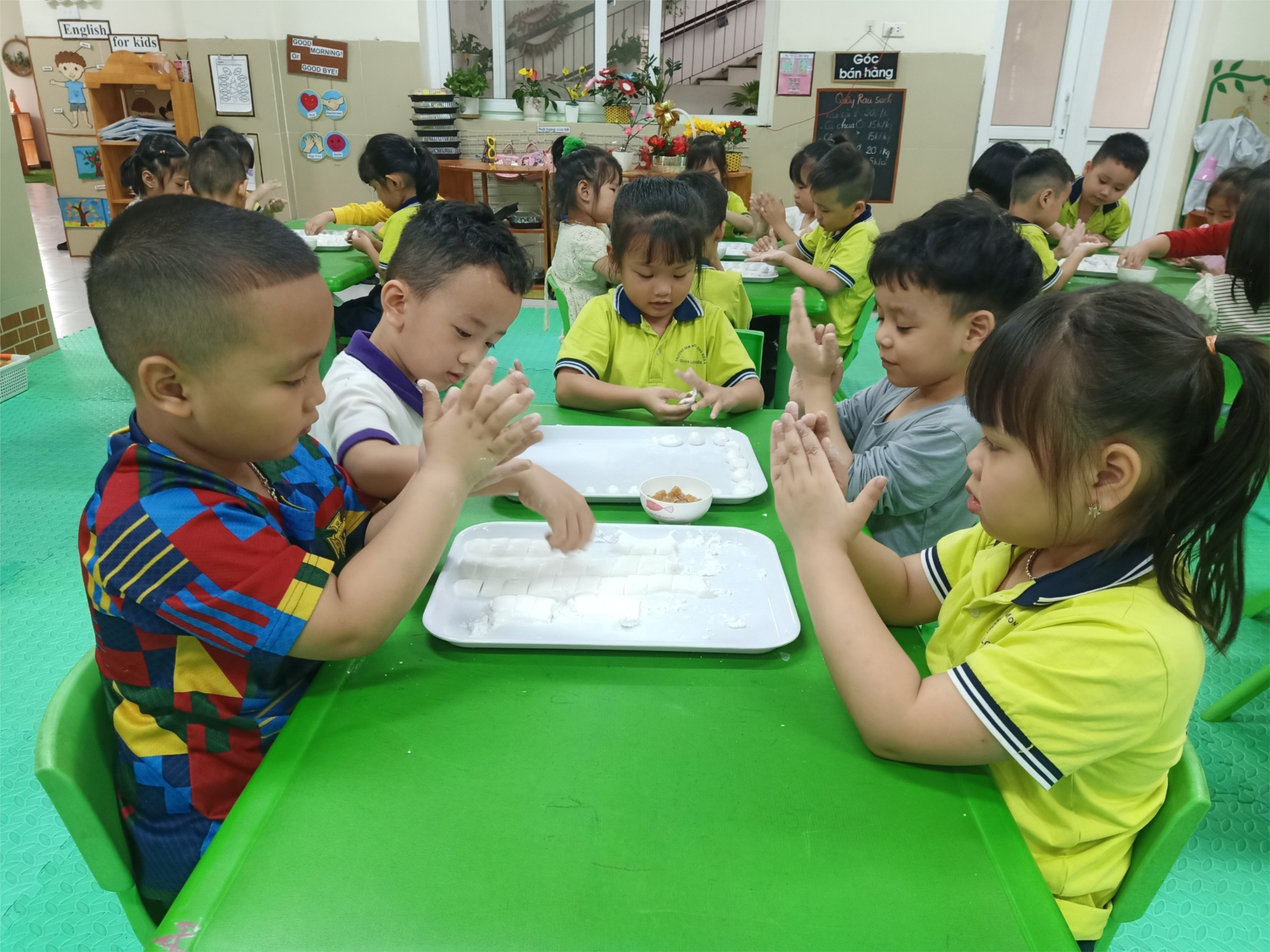 Các bé vô cùng thích thú khi được nghe cô giới thiệu và quan sát các nguyên liệu cô đã chuẩn bị để làm bánh trôi như bột nếp, đường, vừng,…Trước khi nặn cô cho trẻ rửa tay sạch sẽ, sau đó hướng dẫn trẻ cách nặn bánh, luộc bánh, trang trí bánh…Những đôi tay nhỏ xinh xoay tròn, ấn bẹt, cho đường và xoay tròn tạo thành những viên bánh nhiều màu sắc, tròn trịa, xinh xắn trông thật hấp dẫn, đáng yêu.