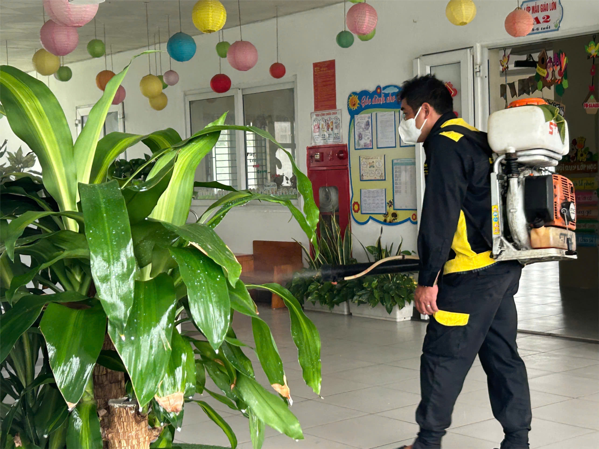 Toàn bộ bên trong tất cả các lớp học, phòng chức năng, khu vực bếp, khu vực hành lang các tầng, khu vực ngoài sảnh; khu vực bếp, nhà vệ sinh, cầu thang, khu vực sân trường, xung quanh trường, vườn trường, khu vui chơi ngoài trời...đều được phun thuốc rất cẩn thận nhằm diệt trừ và phá hủy nơi trú ngụ, sinh sản của muỗi và các loại côn trùng khác.