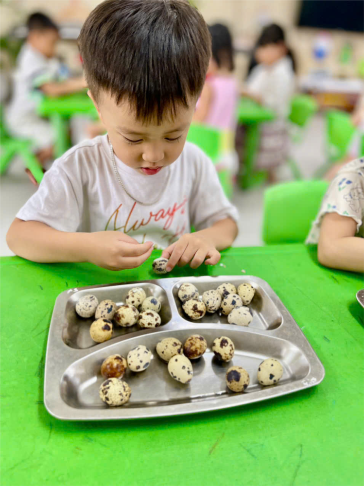 Hoạt động bóc trứng cút đã thực sự thu hút sự tham gia của tất cả các bạn nhỏ, rèn luyện cho các bạn sự khéo léo của đôi bàn tay và kĩ năng làm việc theo nhóm tập trung.