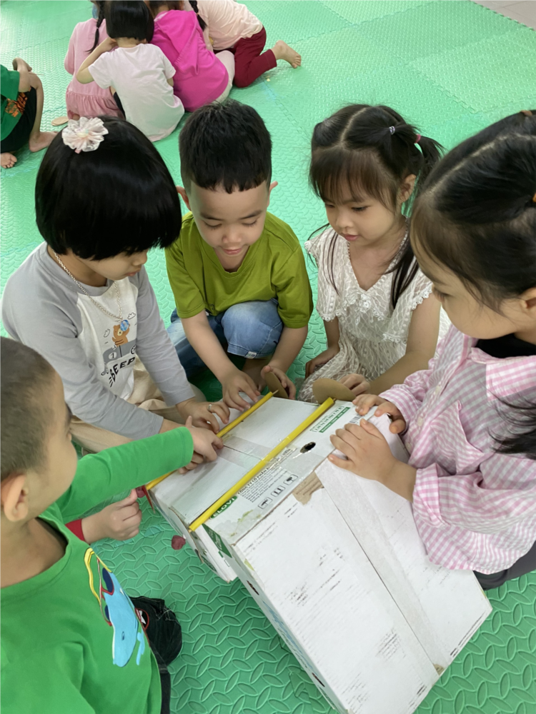 Những giờ học ứng dụng phương pháp giáo dục tiến đã giúp các bạn nhỏ lớp B2 bước đầu được tiếp xúc với công nghệ. Trong giờ học chế tạo ô tô, các bạn đã được cô hướng dẫn và cùng nhau suy nghĩ tìm giải pháp để tạo ra những mô hình ô tô tải từ những vỏ hộp bìa cát tông, giấy bìa, ống hút...Khi sản phẩm hoàn thành đó cũng là lúc cảm xúc vỡ òa, nhóm thì vui mừng phấn khởi khi chiêc ô tô do cả nhóm chung tay thiết kế đã chạy bon bon trên đường, có nhóm lại băn khoan suy nghĩ không biết tại sao chiếc xe của mình lại không chạy được....Thông qua giờ học các bé đã học được cách làm việc nhóm, cách suy nghĩ logic, các biểu lộ cảm xúc....
