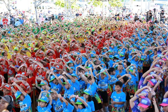 Những vận động viên nhí cùng nhau khởi động trước giờ xuất phát. Ảnh: VnExpress Marathon