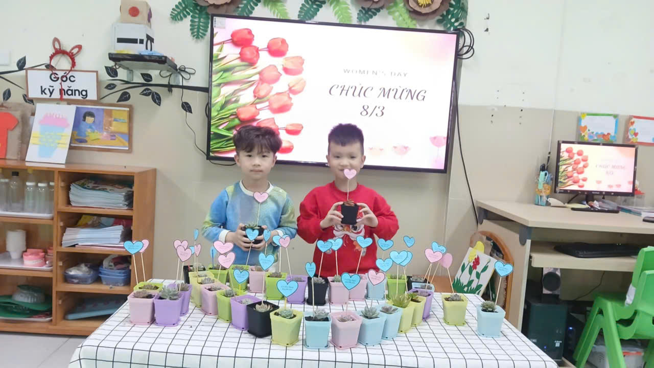 Hoà chung không khí vui tươi kỷ niệm 114 ngày Quốc tế Phụ nữ 8 - 3, ngày của các bà, các mẹ, các chị và các bạn nữ. Bằng đôi bàn tay khéo léo, các bé lớp MGN B2 đã trồng những chậu sen đá xinh xắn để thể hiện tình yêu thương gửi đến tặng bà, tặng mẹ của mình. Kính chúc các bà, các mẹ, các chị ngày 8-3 luôn tươi trẻ, xinh đẹp, hạnh phúc!