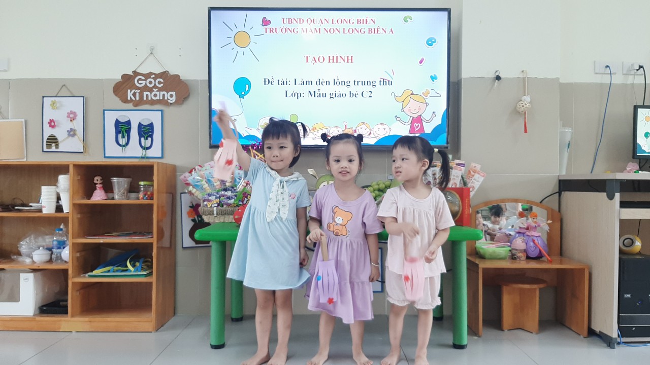 Tại trường Mầm non Long Biên A, Trung thu năm nay thật sự là một ngày hội tưng bừng và đầy ý nghĩa. Các bé đã cùng cô giáo tham gia tìm hiểu những chiếc lồng đèn rực rỡ, đầy màu sắc. Dưới sự hướng dẫn của cô giáo, các bé mỗi người một việc, cùng cô giáo từng bước hoàn thành các sản phẩm của mình.