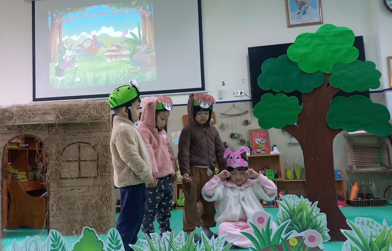 Các bé lớp MG Nhỡ B1 trường MN Long Biên A đã tham gia tập đóng kịch truyện" Cáo ,thỏ và gà trống" qua câu chuyện giúp trẻ phát triển ngôn ngữ, cách biểu cảm, diễn đạt lời nói và điệu bộ cử chỉ qua các hành động khi được đóng vai các nhân vật trong câu chuyện.