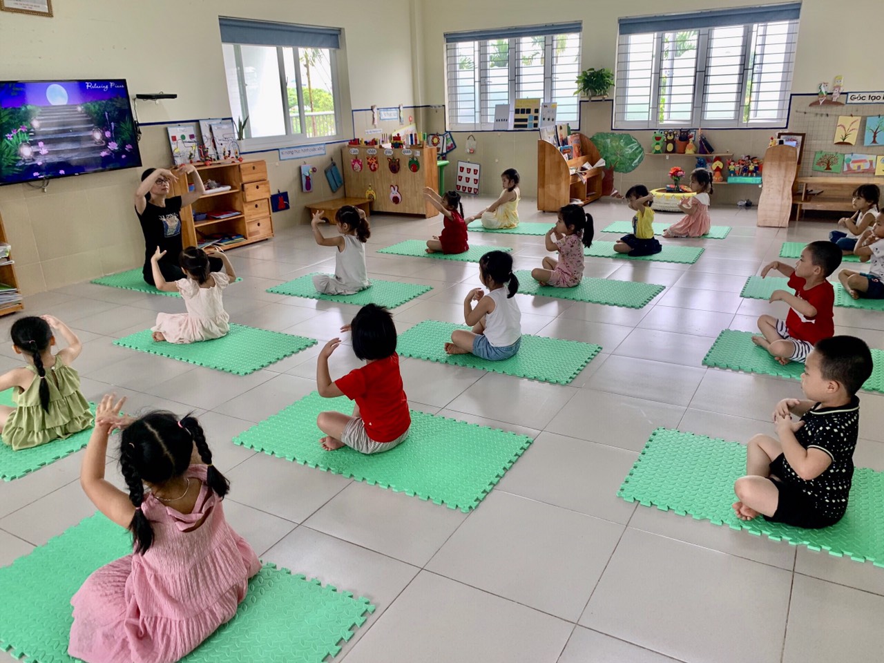Không như Yoga dành cho người lớn tập luyện trên nền nhạc thiền tĩnh; giờ học Yoga Kids nên được bắt đầu bằng những điệu nhạc vui nhộn hay một câu chuyện cổ tích mô phỏng hoạt động của các loài động vật. Thông qua việc hướng trí tưởng tượng của trẻ tới hình ảnh của những con vật quen thuộc, người Giáo viên sẽ nhanh chóng “bắt nhịp” cảm hứng, giúp cho tiết học trở nên hấp dẫn hơn bằng việc hướng dẫn trẻ tập ngồi, tập bò, tập hít thở, đi, đứng… như các con vật trong truyện.