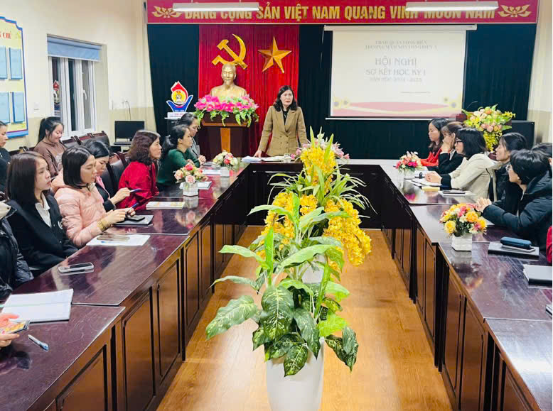Tại buổi hội nghị đ/c Đào Thị Thu Hương – Bí thư chi bộ – Hiệu trưởng nhà trường đã thông qua báo cáo sơ kết học kỳ 1 năm học 2024 - 2025. Trong báo cáo, đ/c biểu dương những thành tích mà nhà trường đã đạt được trong học kỳ vừa qua. Đồng thời, đưa ra phương hướng, mục tiêu, nhiệm vụ mà nhà trường sẽ tiếp tục cố gắng, phấn đấu trong học kỳ tới. Và mong rằng với sự đoàn kết của tập thể, chung sức đồng lòng, quyết tâm vượt khó của đội ngũ CBGVNV, nhà trường sẽ tiếp tục gặt hái được nhiều thành quả hơn nữa trong công tác dạy và học của nhà trường.