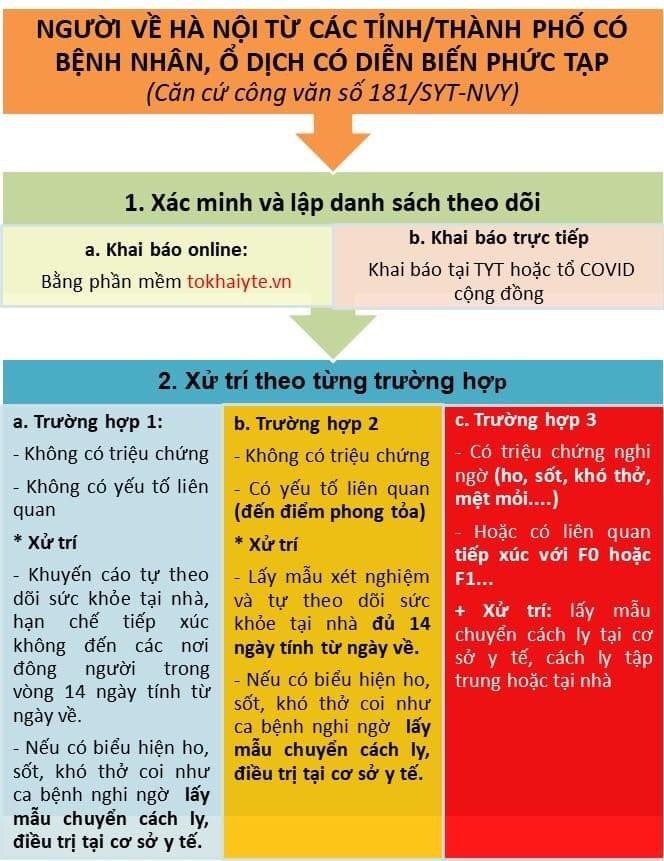 Theo đó, người về Hà Nội từ các tỉnh, thành phố có dịch phải thực hiện khai báo y tế theo 2 cách, đó là khai báo online bằng phần mềm tokhaiyte.vn và khai báo trực tiếp tại trạm y tế hoặc Tổ COVID cộng đồng. Sau đó, những người này sẽ được phân thành 3 trường hợp.