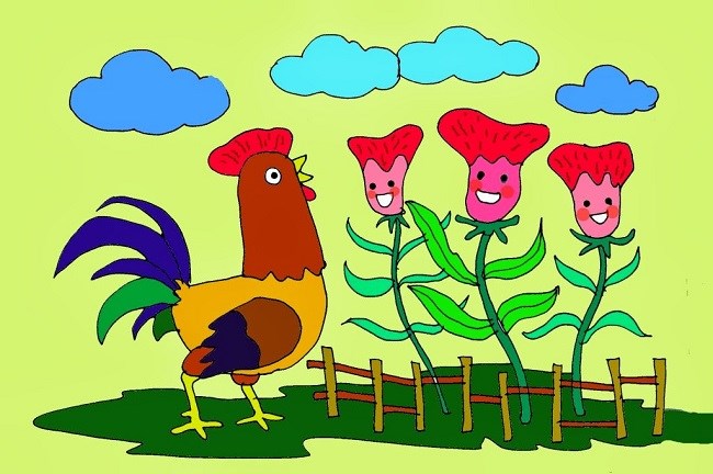 Cây hoa sung sướng vươn mình đón ánh mặt trời nhuộm cho bông hoa thêm đỏ thắm. Cây khe khẽ kể cho mọi người nghe câu chuyện về lòng tốt của Gà Mơ. Thế là mọi người gọi cây đó là cây hoa mào gà.