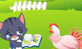 Mè !important;o con ngồi bên một hốc cây, trên tay chú là quyển sách tậo tô rất mới, rất đẹp. Mèo con ngắm nghía một lúc rồi “soạt! soạt!”, chú ta xé quyển sách. Thấy vậy, bác Gà trống đang kiếm mồi gần đó liền hỏi: