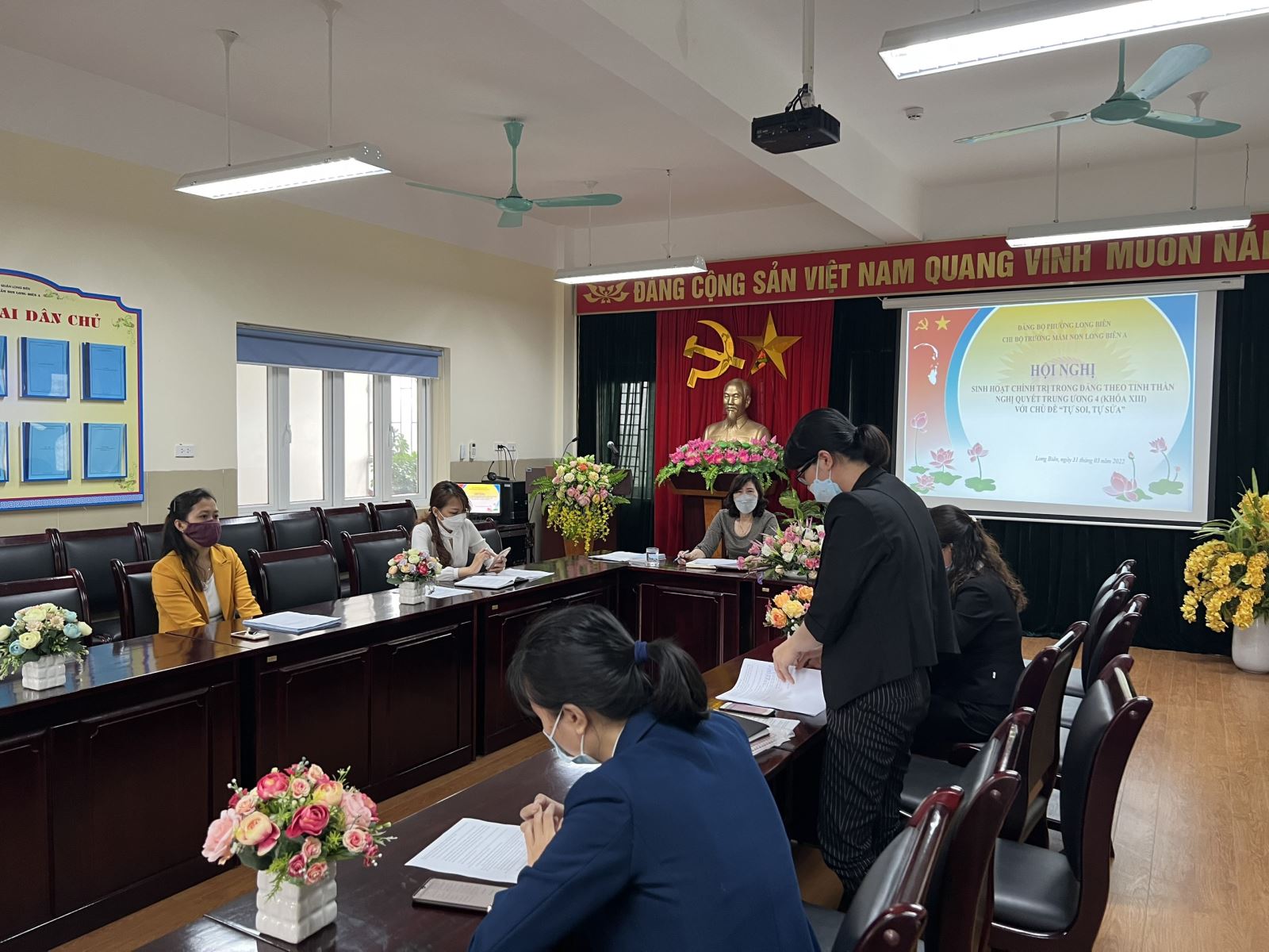 Vào hồi 9h sáng nay, ngày 31/3/2022, tại phòng họp của nhà trường, chi bộ trường MN Long Biên A đã tổ chức buổi sinh hoạt chính trị trong Đảng theo tinh thần Nghị quyết Trung ương 4 (khóa XIII) với chủ đề "Tự soi, tự sửa". Buổi sinh hoạt được diễn ra nghiêm túc, đông đủ với 100% đảng viên tham dự.