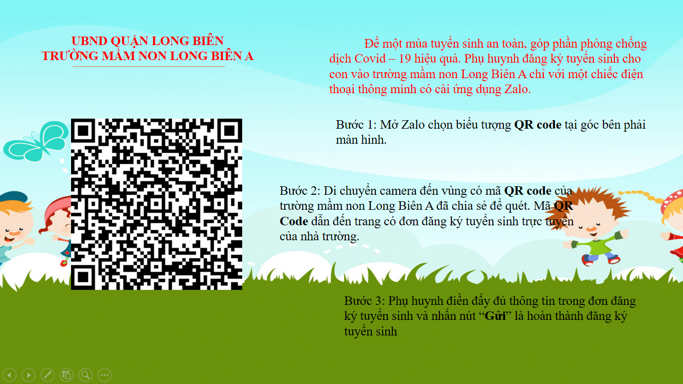 Để đảm bảo an toàn trong thời gian thực hiện giãn cách theo chỉ thị số 16 của Thủ tướng Chính phủ, chỉ thị số 17 của Chủ tịch UBND Thành phố Hà Nội. Trường mầm non Long Biên A rất mong PHHS thực hiện đăng ký nhập học cho con theo hình thức trực tuyến qua quét mã QR Code được nhà trường đăng tải trên cổng TTĐT, Zalo, điện thoại đã được công khai. Nhà trường chỉ nhận hồ sơ nhập học khi học sinh tựu trường.